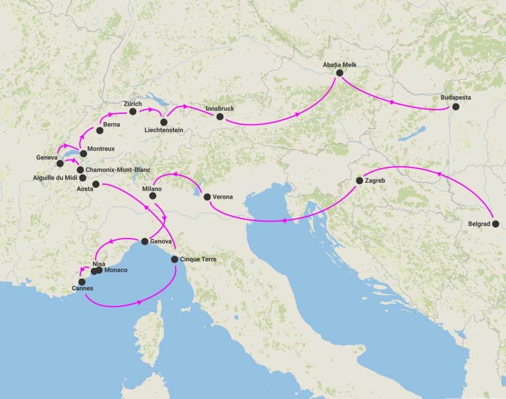 Itinerariu: Belgrad - Zagreb - Verona - Milano - Genova - Nisa - Cannes - Monaco - Cinque Terre - Aosta - Chamonix-Mont Blanc - Aiguille du Midi - Annecy - Geneva - Montreux - Berna - Zurich - Liechtenstein - Innsbruck - Abatia Melk - Budapesta