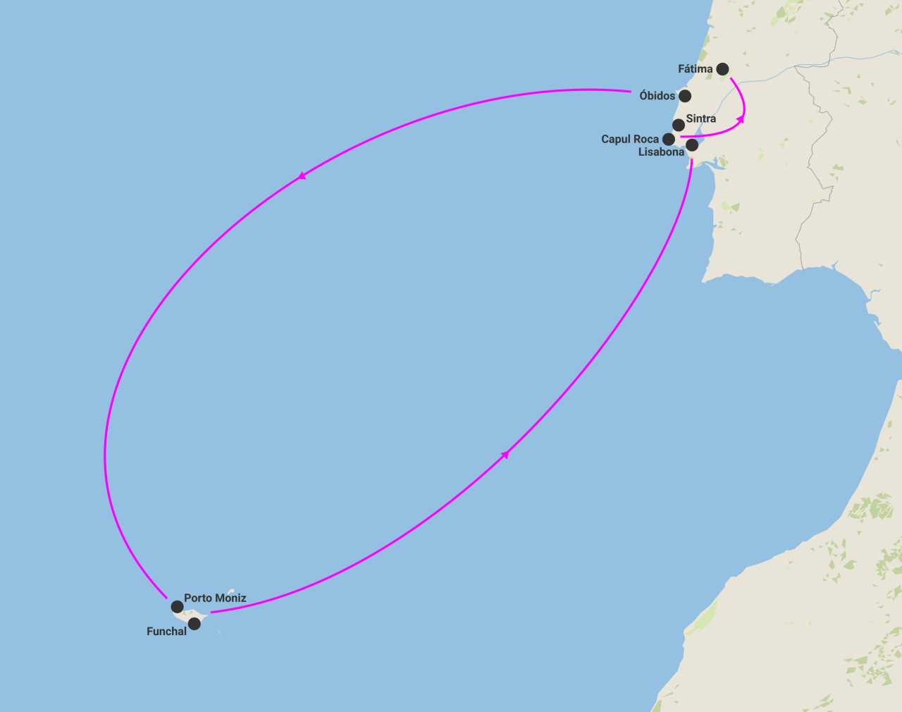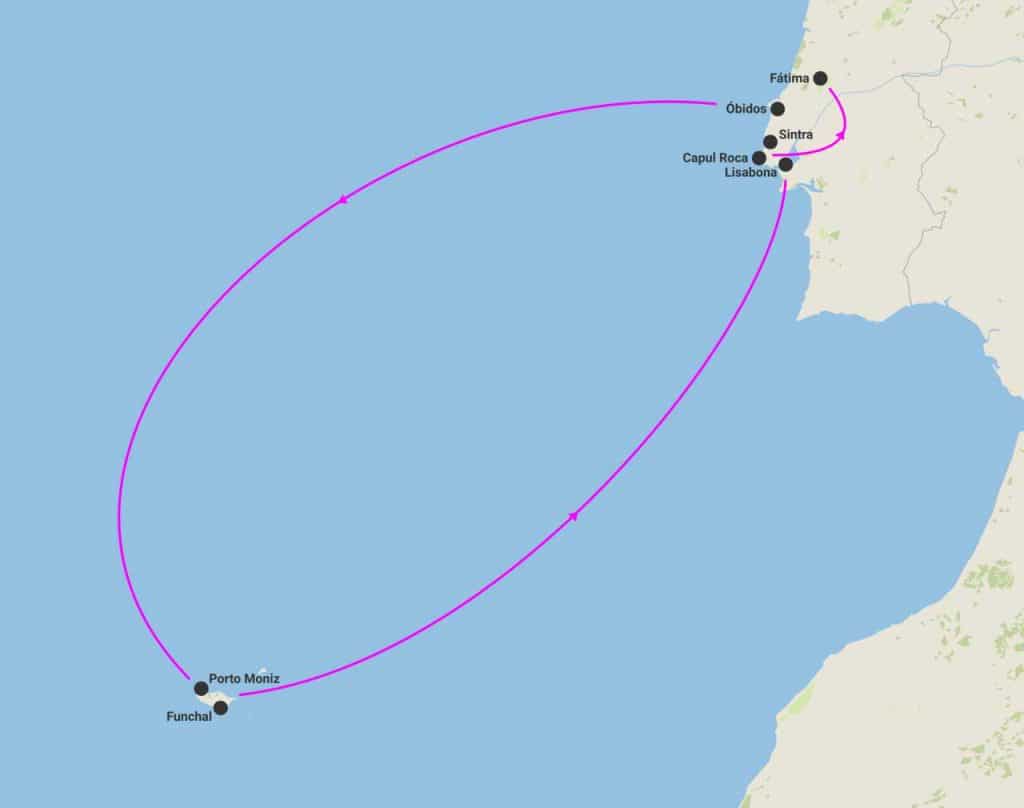 Itinerariu: Lisabona - Sintra - Cabo Da Roca - Fatima - Nazare - Obidos - Funchal - Porto Moniz - Funchal - Lisabona