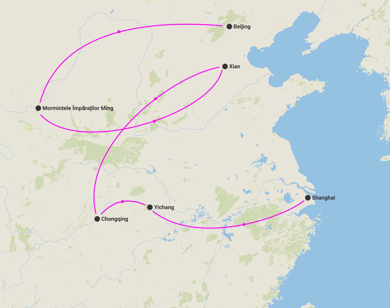 Itinerariu: Beijing (Piata Tian'anmen Orasul Interzis) - (Marele Zid Chinezesc - Mormantul Ming - Drumul Sacru)- XIan(Soldatii de Teracota - Turnul Bell) - Chongqing-Croaziera pe Yangtze - Shibaozhai - Chongqing - Barajul celor trei Defilee - Yichang - Shanghai