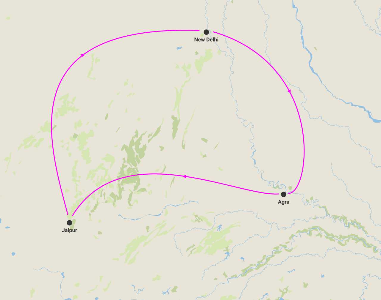 Itinerariu: New Delhi (Rashtrapati Bhavan - Bangla Sahib Gurudwara - Bangla Sahib Gurudwara - Fortul Rosu - Jama Masjid - Mormantul lui Humayun - Gradinile Lodi) - Agra(complexul Qutub - Taj Mahal - Fortului Agra) - Jaipur( Fortul Amber - Fatehpur Sikri - Jal Mahal) - New Delhi