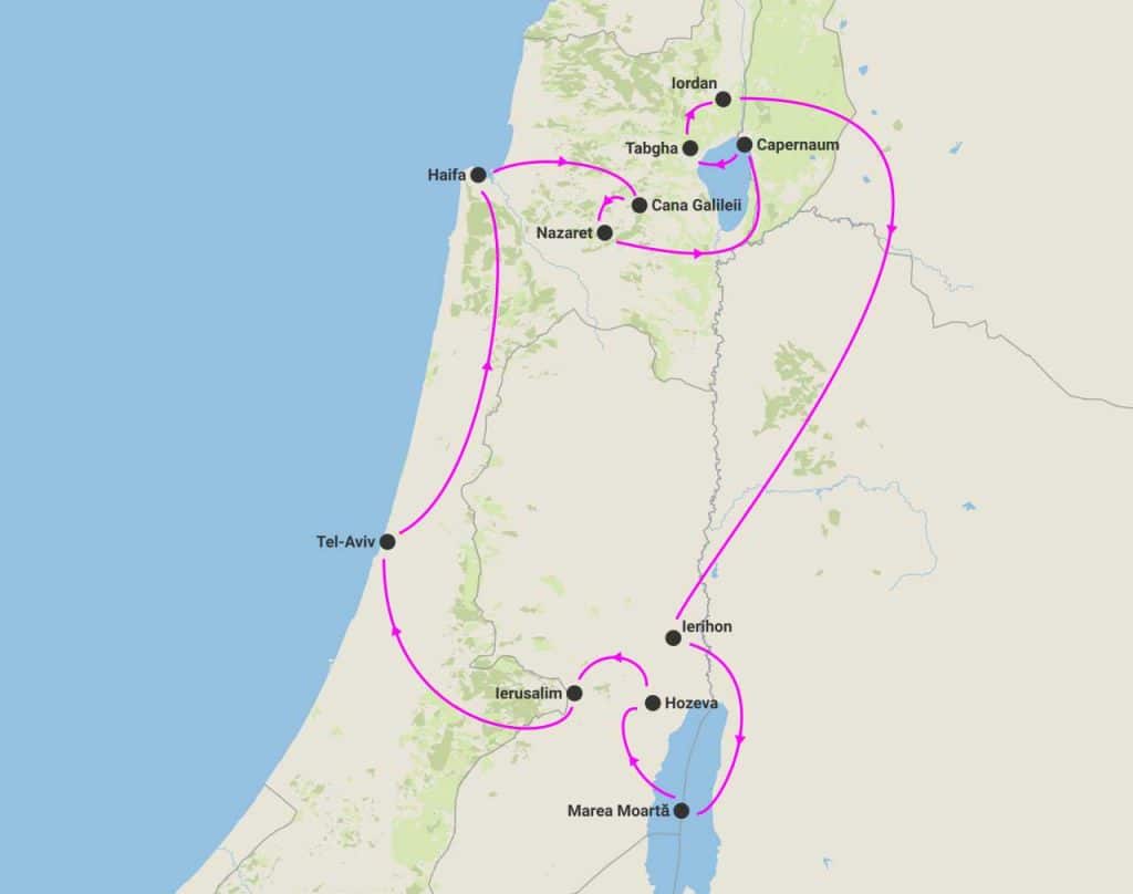 Itinerariu: Tel Aviv - Haifa - Cana Galileii - Nazareth - Capernaum - Tabgha - Mt. Fericirii - Iordan - Ierihon - Marea Moarta - Hozeva - Ierusalim Muntele Maslinilor - Via Dolorosa - Muntele Sion - Ein Karem - Tel Aviv