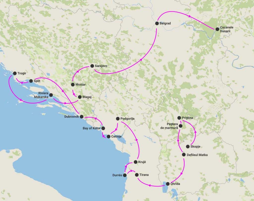 Itinerariu: Sofia - Skopje - Pristina (Kosovo) - Canionul Matka - Ohrid - Tirana - Durres - Podgorica - Cetinje - Boka Kotorska - Dubrovnik - Medugorje - Split - Trogir - Riviera Makarska - Blagaj - Mostar - Sarajevo - Belgrad
