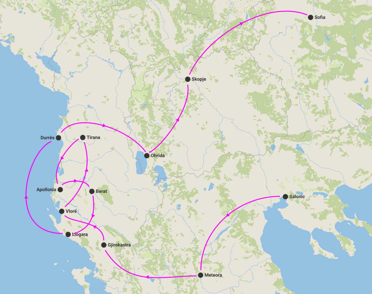Itinerariu: Salonic - Meteora - Gjirokastra - Vlora - Tirana - Apolonia - Berat - Butrint - Llogara - Durres - Ohrid - Skopje - Sofia