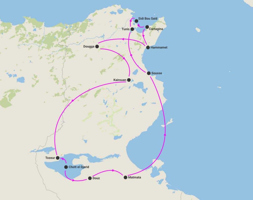 Itinerariu: Tunis - Sidi Bou Said - Cartagina - Hammamet - Dougga - Kairaoun - Tozeur - Chott Djerid - Douz - Matmata - Sousse - Tunis